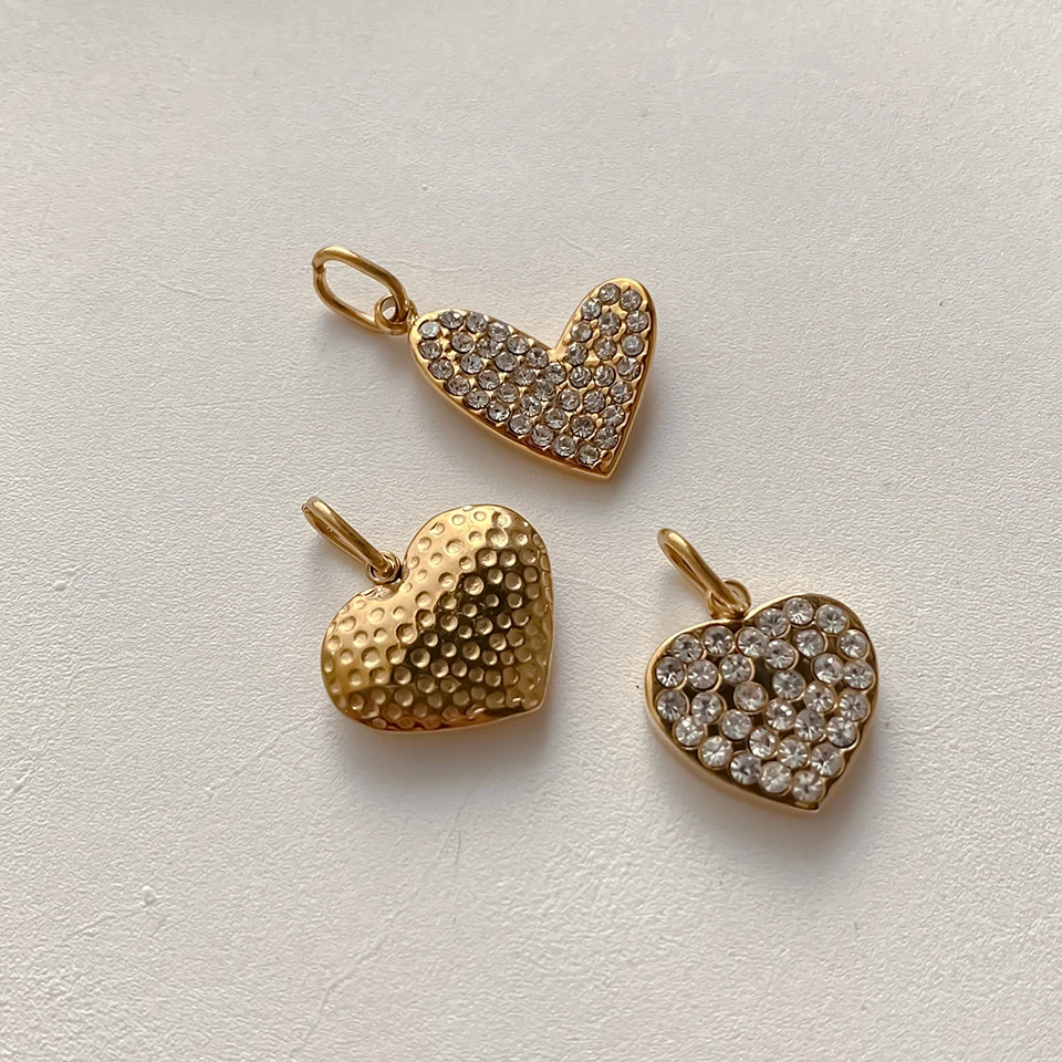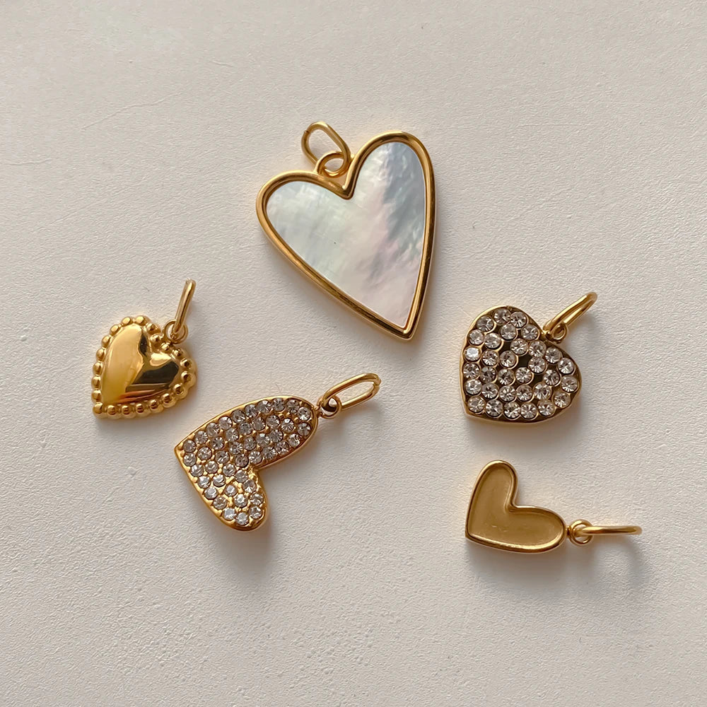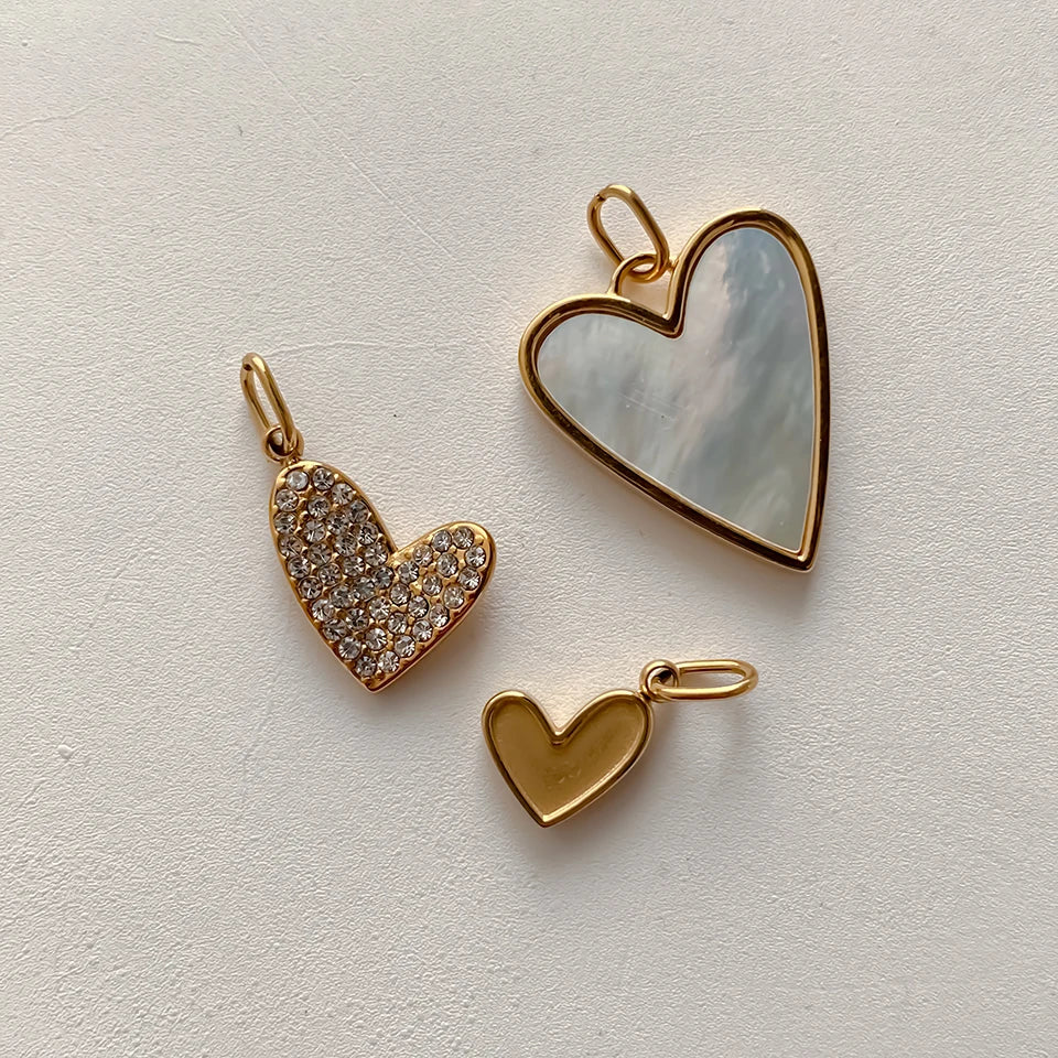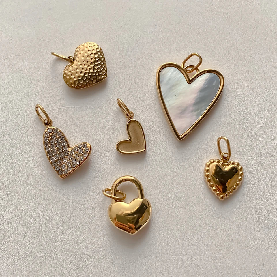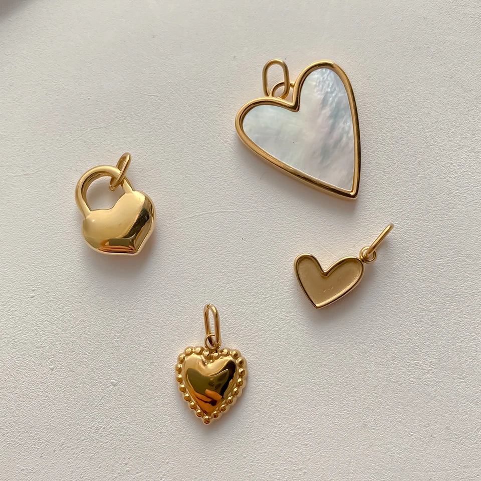 Entdecke unsere vielseitige Heart Charm Kollektion in 14k Vergoldung: Von schlicht bis luxuriös mit Kristallen besetzt, mit strukturierter Oberfläche oder Perlmutt-Einlage. Die perfekten Herzanhänger für deine DIY Kette oder als romantisches Geschenk – zeitlose Liebesbotschafter für jeden Anlass.